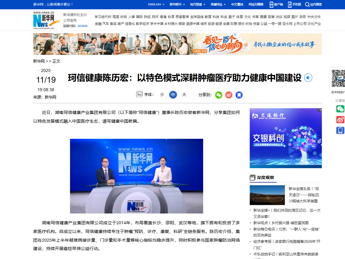 近日,湖南珂信健康产业集团有限公司(以下简称“珂信健康”)董事长陈历宏做客新华网,分享集团如何以特色发展模式融入中国医疗生态,谱写健康中国新篇。